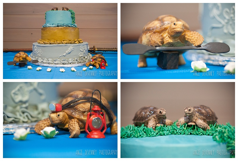 The Meeting: “Chris and I met at the Cincinnati Museum Center in Cincinnati, Ohio and started dating November 23, 2010. (Jen’s grandparents actually met at a USO event in the exact same building back when it was a train station during WWII!) Chris worked with the live animal collections and I teach school children who come to the museum on field trips. We just started chatting in the offices and soon started to hang out outside of work. I shared all of my favorite hobbies and interests with Chris – kayaking, travel, gardening, history, spending time outdoors and my basset hound Byron. And he shared all of his favorite hobbies and interests with me – caving, reptiles, travel, hiking, camping, science and MMA. We agreed to disagree on the reptiles and MMA, however, now he is my awesome kayaking buddy and I am his tolerable caving companion.” (Note the tortoises’ gear below….a kayaking paddle and some caving gear 🙂